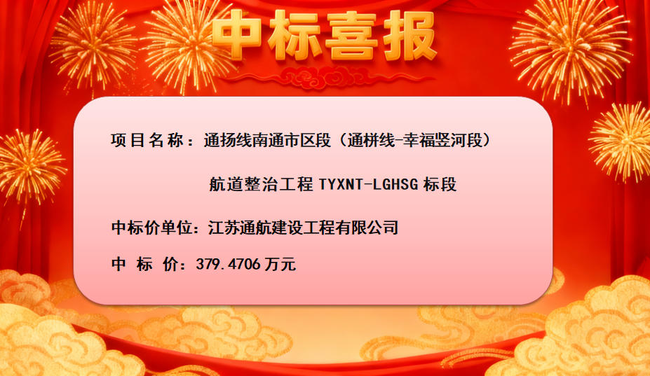 近日,由南通市江海河聯(lián)運項目建設指揮部招標的通揚線南通市區(qū)段(通栟線-幸福豎河段)航道整治工程TYXNT-LGHSG標段招標結(jié)果正式揭曉,江蘇通航建設工程有限公司成功中標,中標價為379.4706萬元,項目計劃工期為120日歷天,預計將有力推動南通內(nèi)河航道的高質(zhì)量建設。